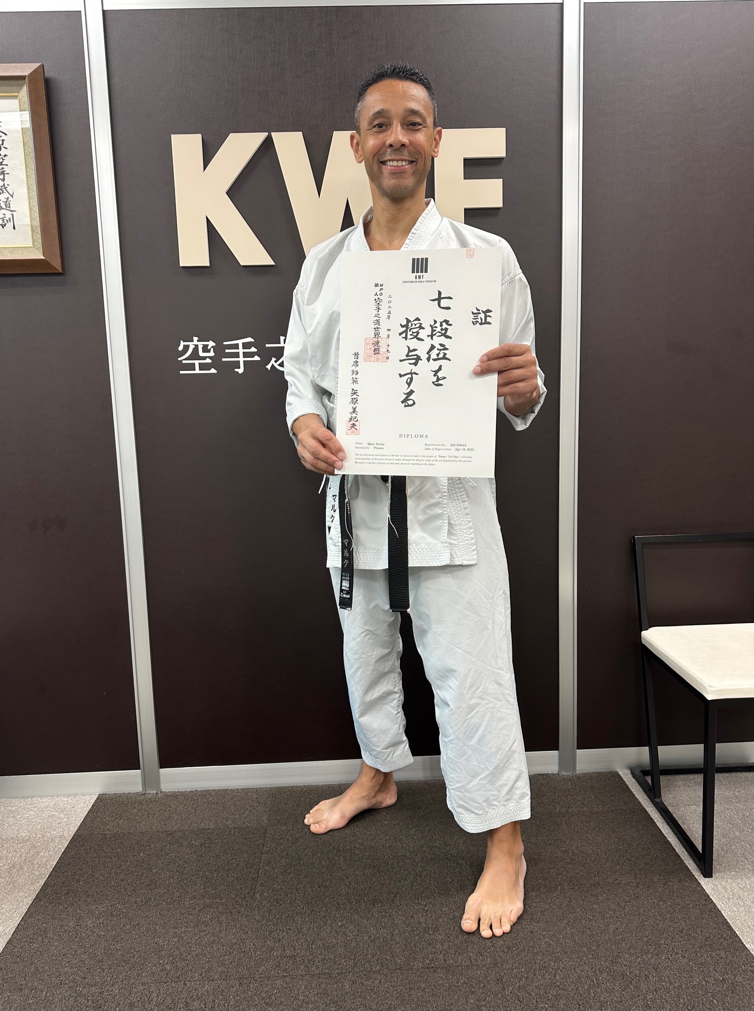 Marc Feldis a reçu au Japon le 7e dan des mains du légendaire Mikio Yahara Shihan, Chef instructeur de la KWF, ce qui fait désormais de lui le plus jeune karate-ka français à s’être vu décerner un 7e dan par une organisation japonaise de karate shotokan.