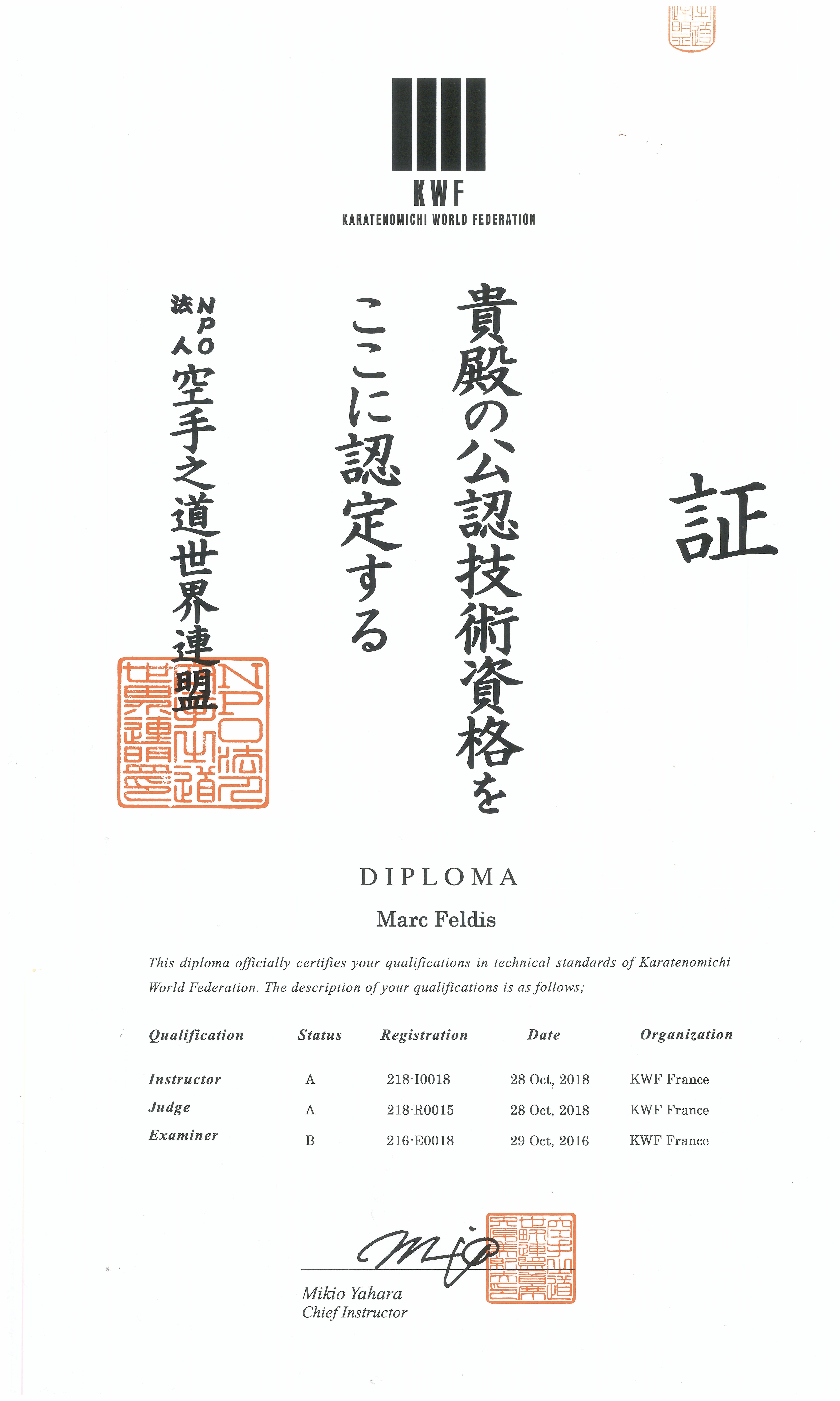 A l’automne 2016, Marc obtient au Japon le 6e dan devant un jury composé notamment de Mikio Yahara Sensei et de Sakae Ibusuki Sensei, élève direct du maître Gichin Funakoshi à l’université de Waseda.